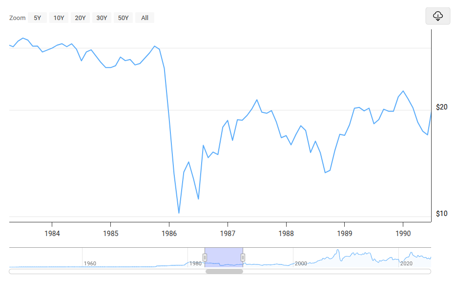 A similar % of oil went through the strait during the Iran-Iraq tanker wars in 84-88 in which over 200 tankers were struck. Iran also attacked Saudi and UAE ships back then. It barely seemed to have affected oil prices (not inflation adjusted) and US only intervened in middle of 88: